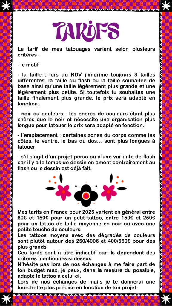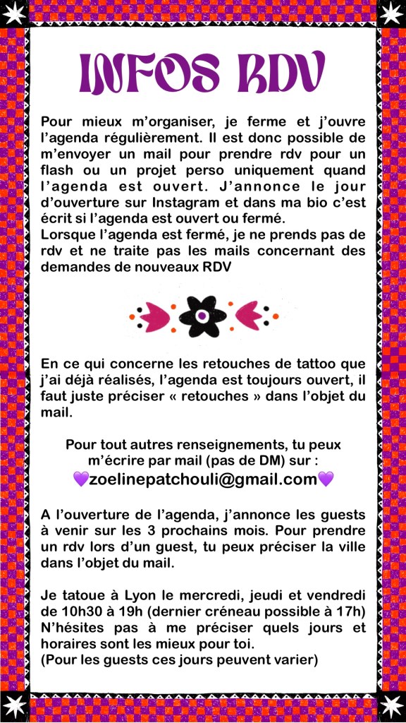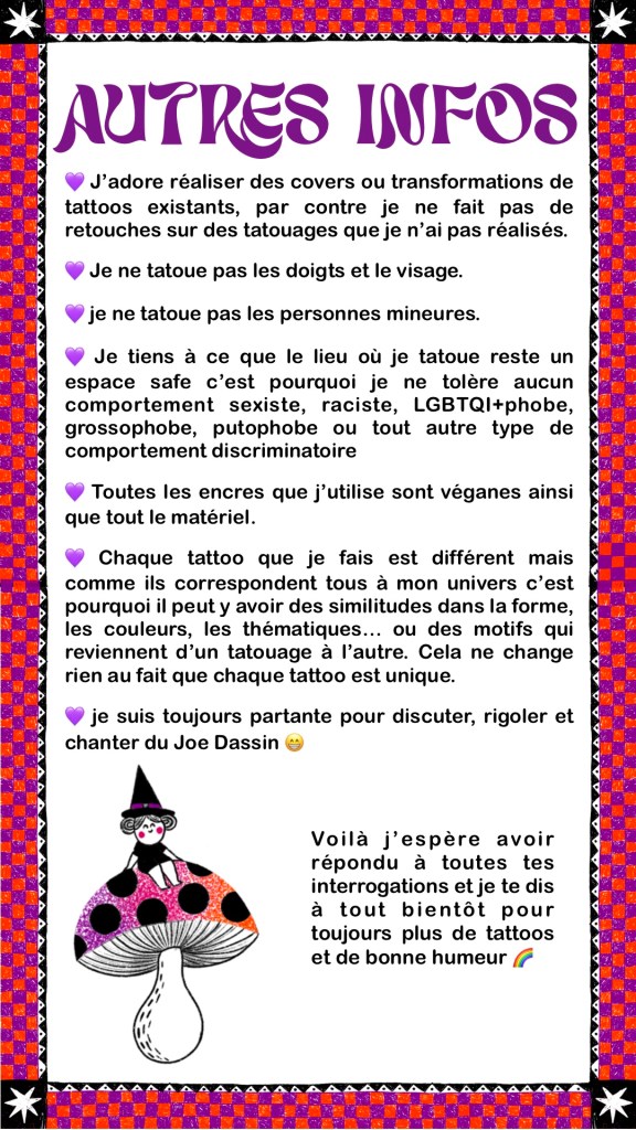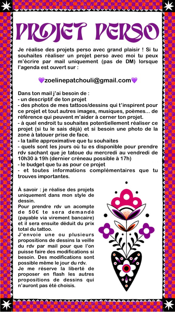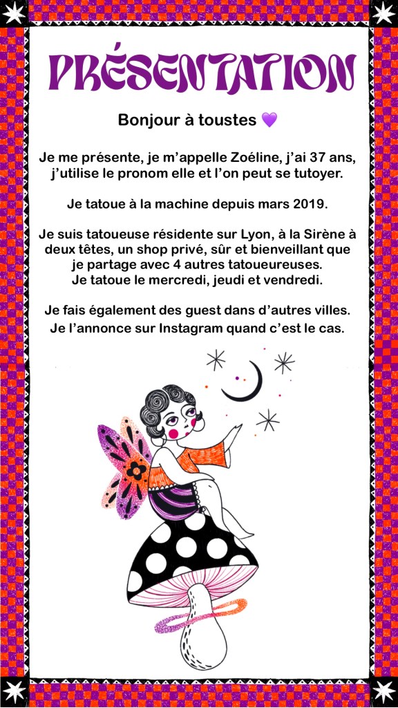 Bonjour, je suis Zoéline Patchouli, nantaise d’origine, installée à Lyon depuis 15ans. Ancienne costumière et créatrice de vêtements, j’ai eu envie de troquer mes aiguilles de couture pour celles du tatouage en 2019. Je travaille à Lyon en tant que tatoueuse à « La Sirène à deux têtes », c’est mon propre shop que je cogère avec 4 autres artistes. Mon univers est folklorique, seventies et coloré. J’aime orner les peaux d’animaux magiques, de cœurs fleuris et de personnages mystiques. Je décline mes dessins aussi sur papier ou tissus en impression numérique, sérigraphie ou linogravure. Mon carnet de croquis ne me quitte jamais, j’aime y dessiner des paysages, mes souvenirs de voyages et toutes les inspirations qui me passent par la tête.