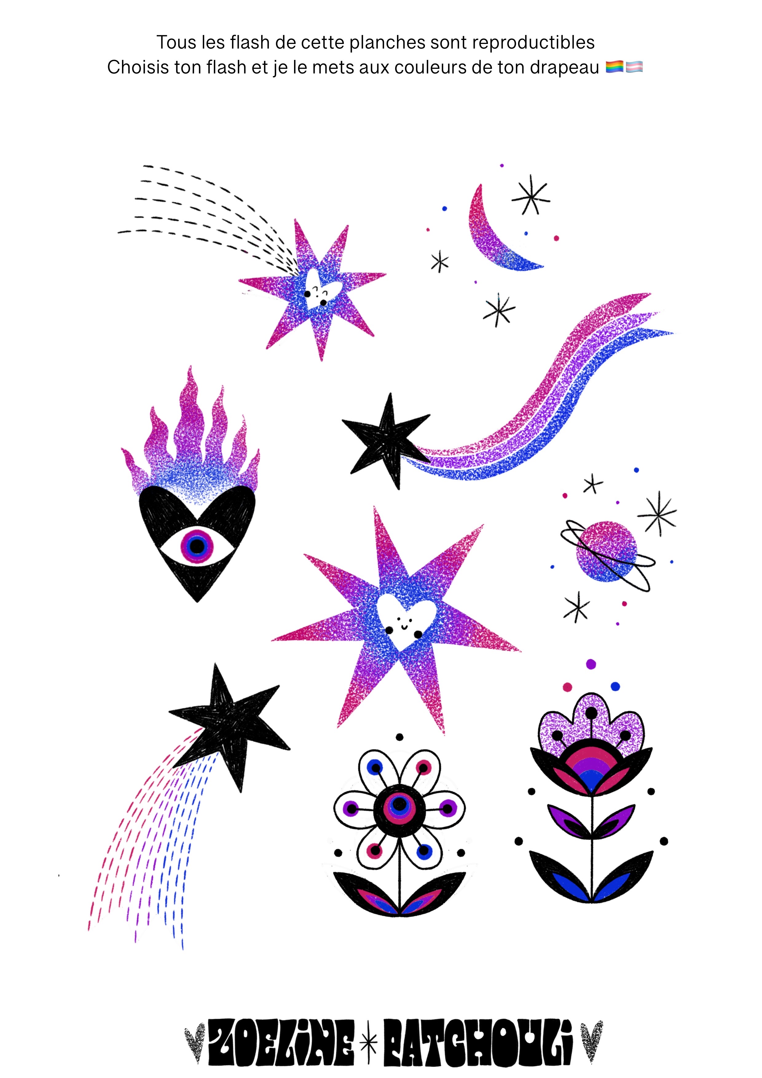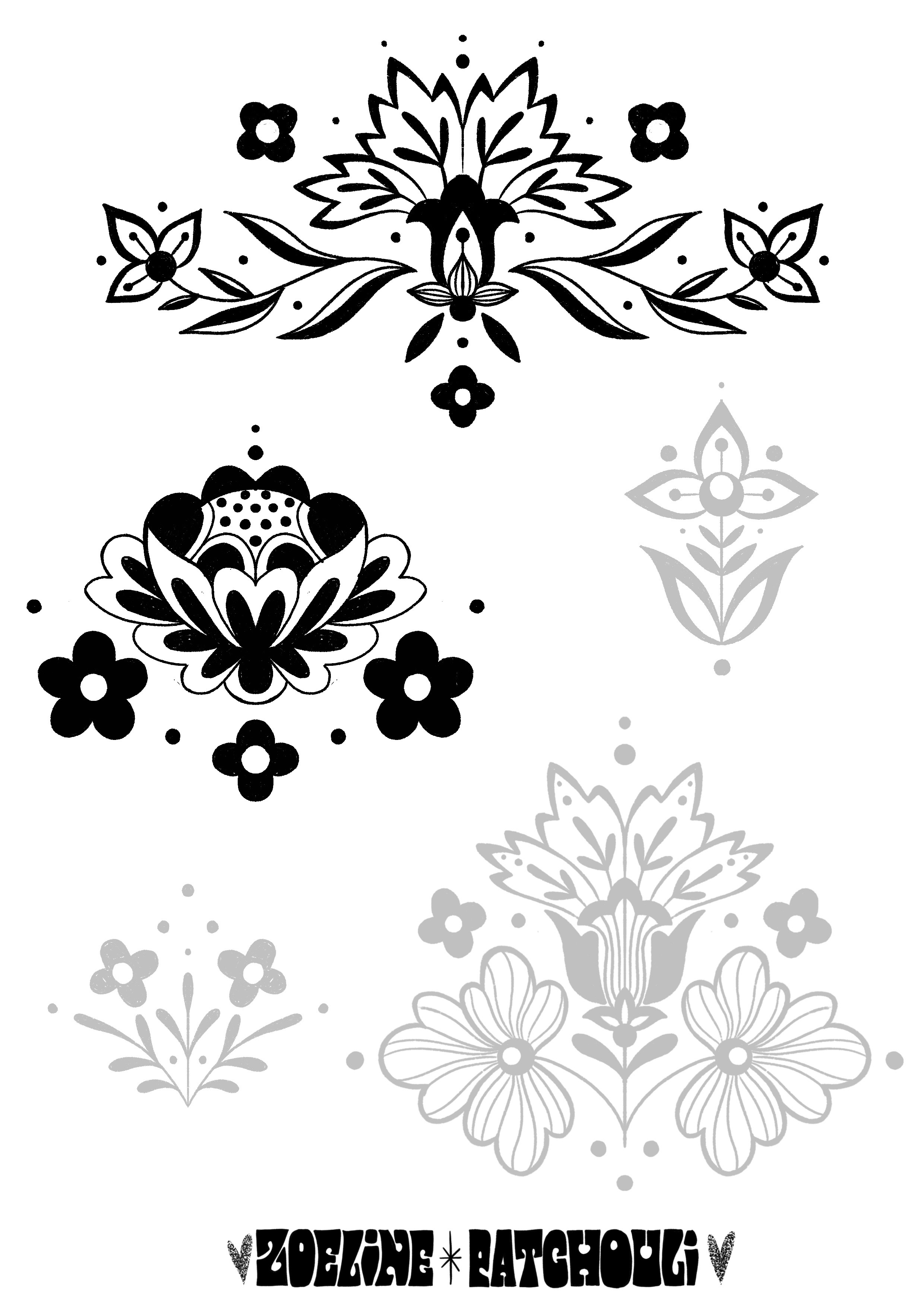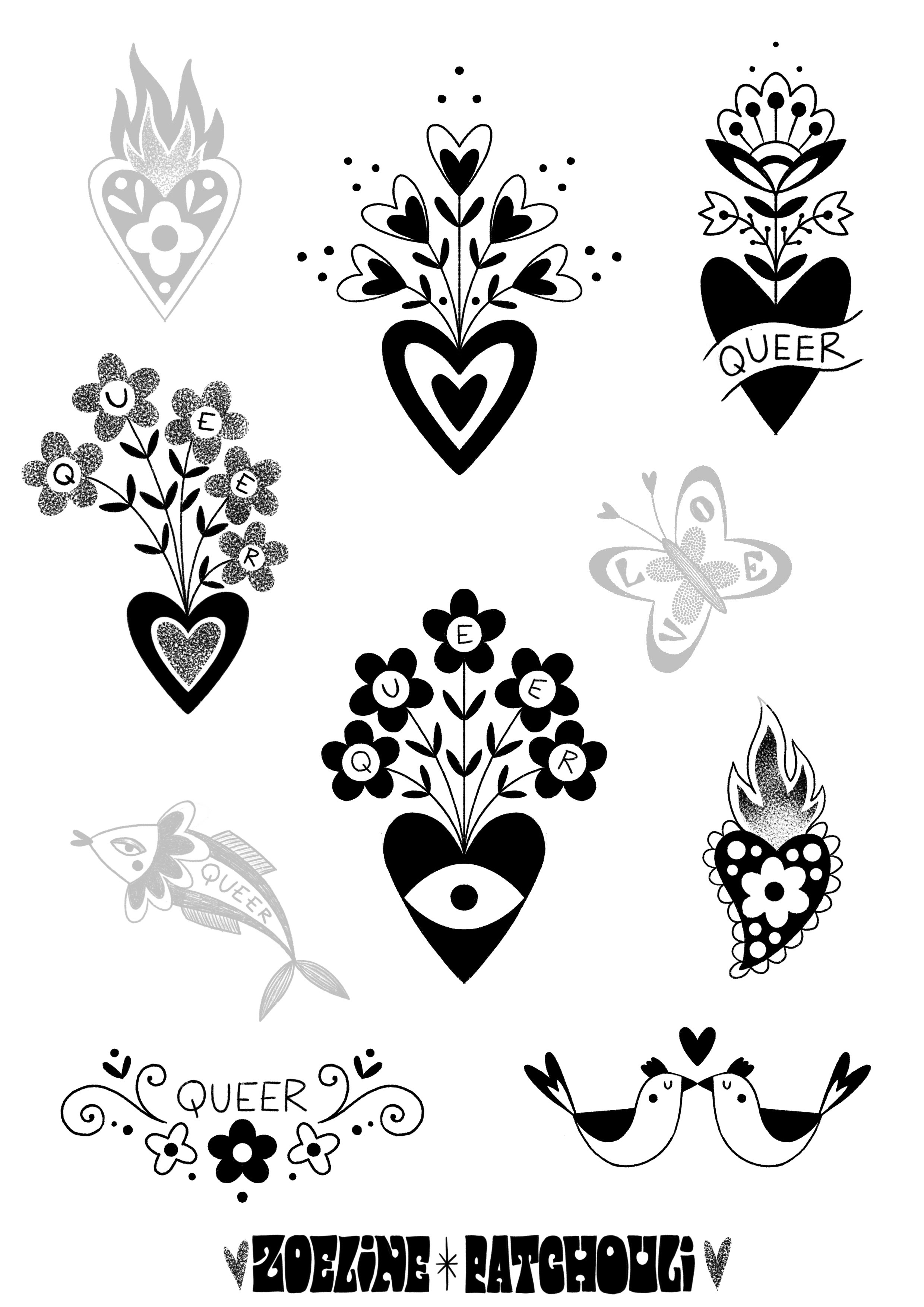 Les flash en grisé sont déjà tatoués mais je peux toujours faire une variante. Également, tous les flash peuvent être tatouer seulement en noir ou je peux modifier les couleurs.