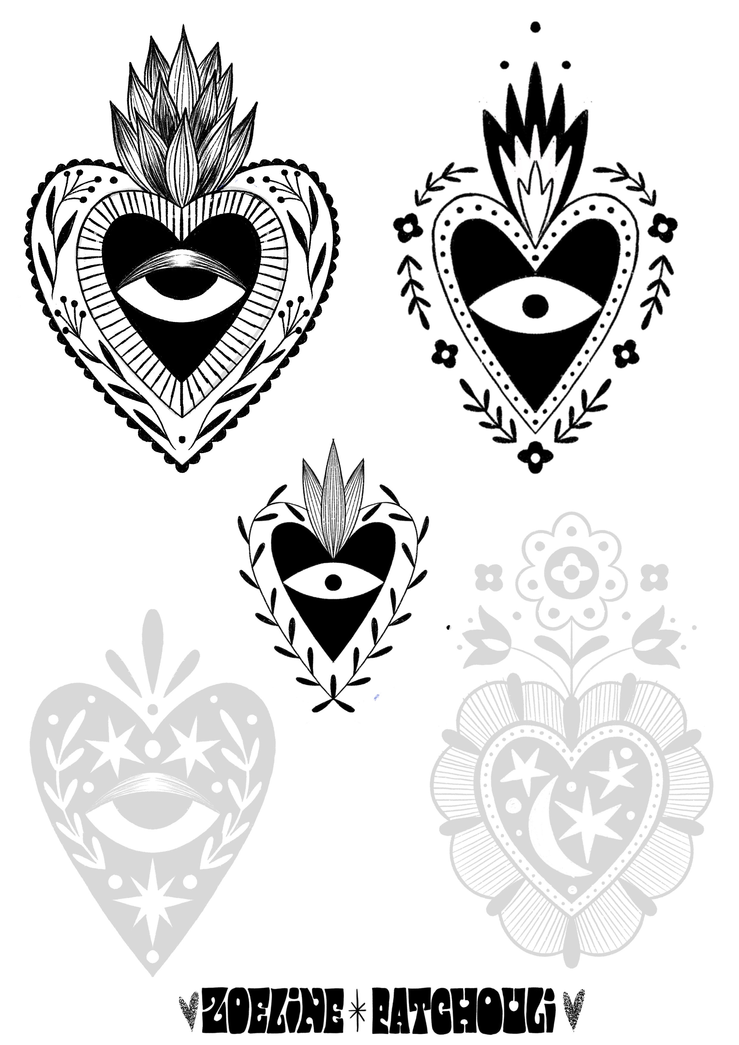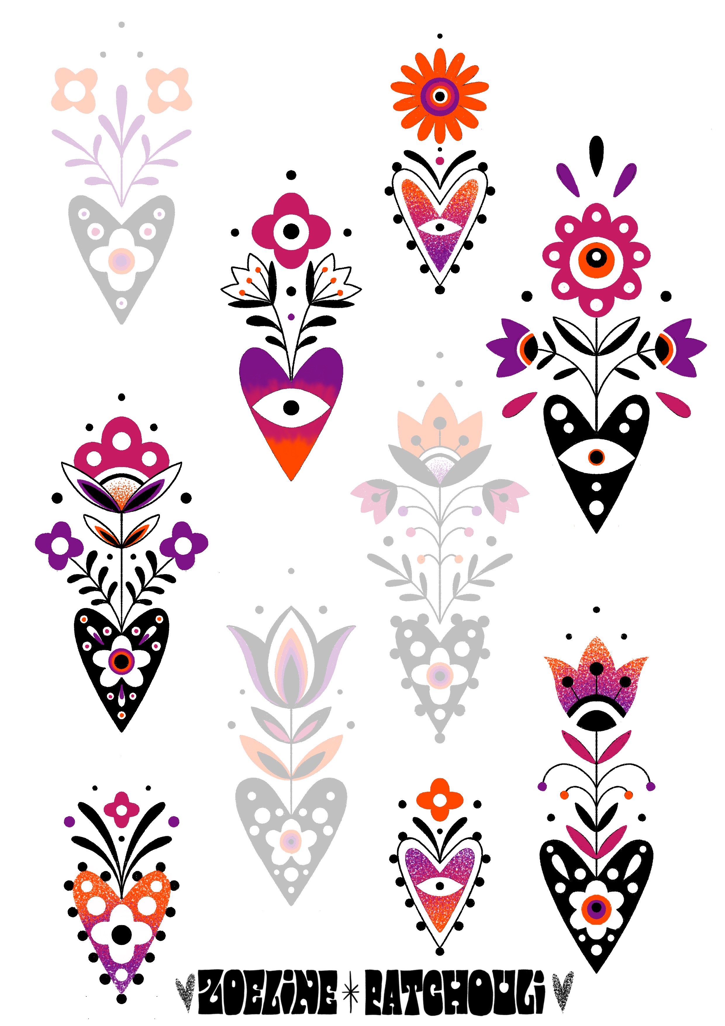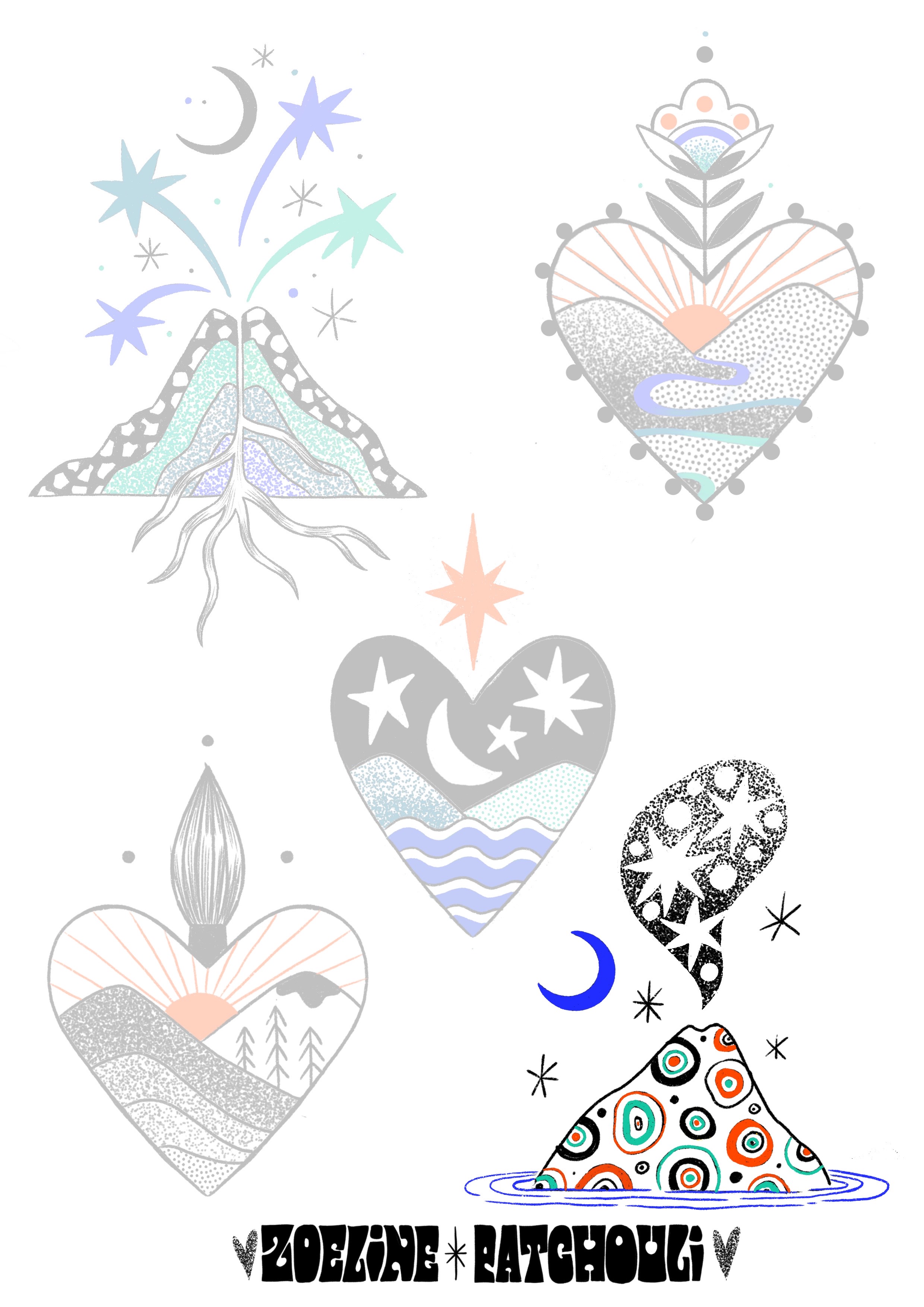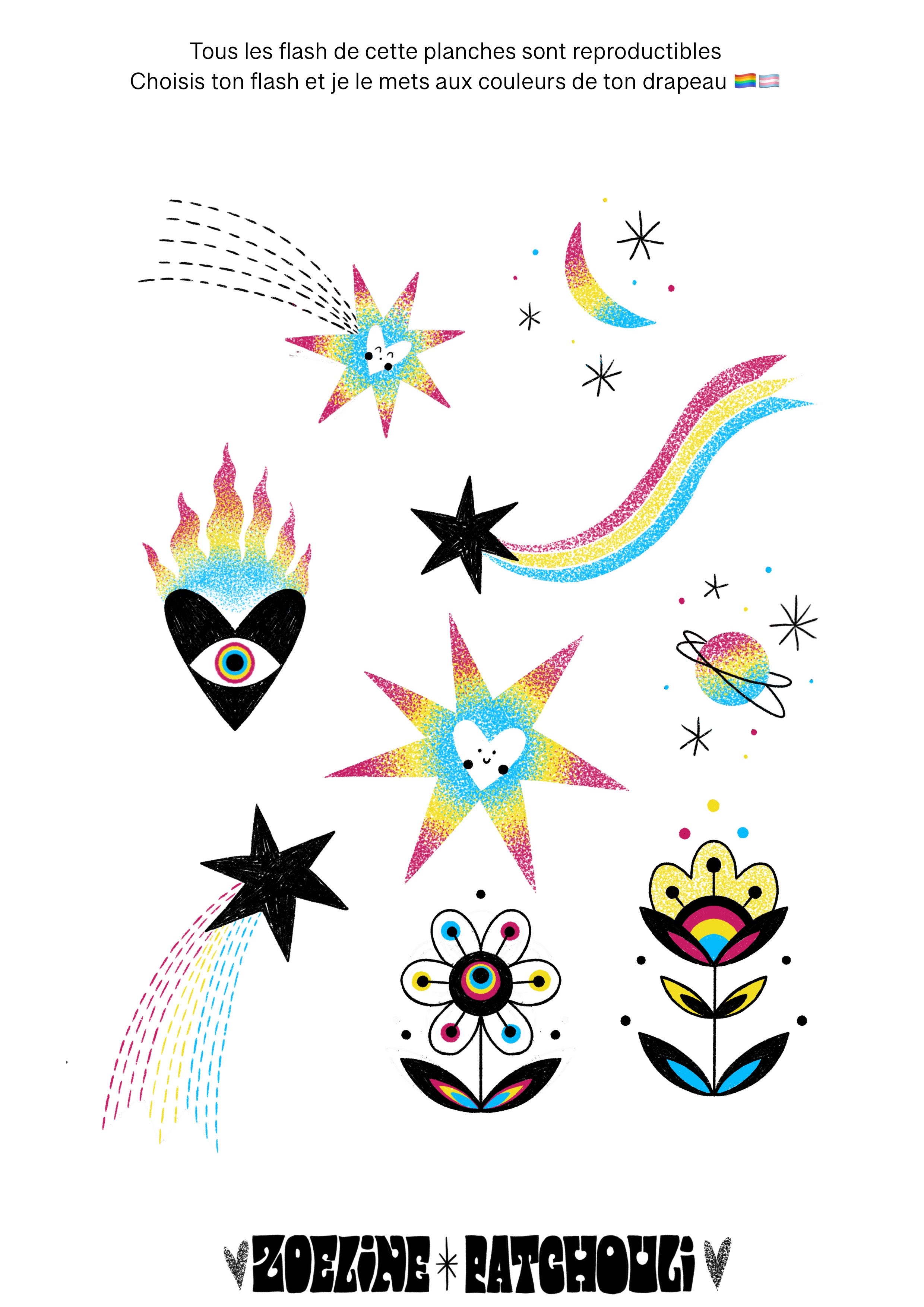 Les flash en grisé sont déjà tatoués mais je peux toujours faire une variante. Également, tous les flash peuvent être tatouer seulement en noir ou je peux modifier les couleurs.